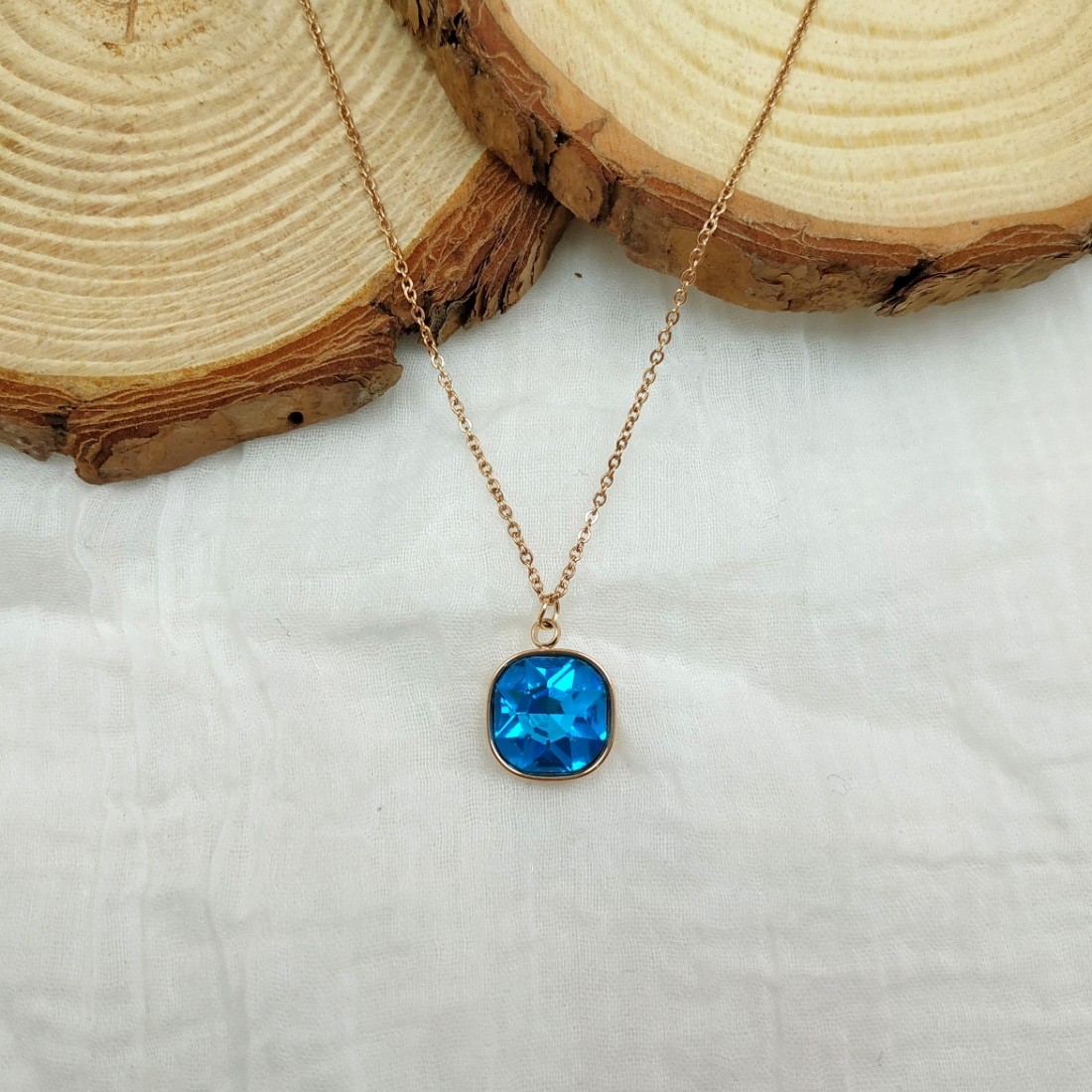 btn btn btn Out-of-Stock STEEL NECKLACE GOLD PLATED STAINLESS STEEL NECKLACE WITH BLUE CRYSTAL PENDANT €12.00 GOLD PLATED STAINLESS STEEL NECKLACE WITH BLUE CRYSTAL PENDANT (DIMENSIONS : LENGTH 40 - 46 CM) View